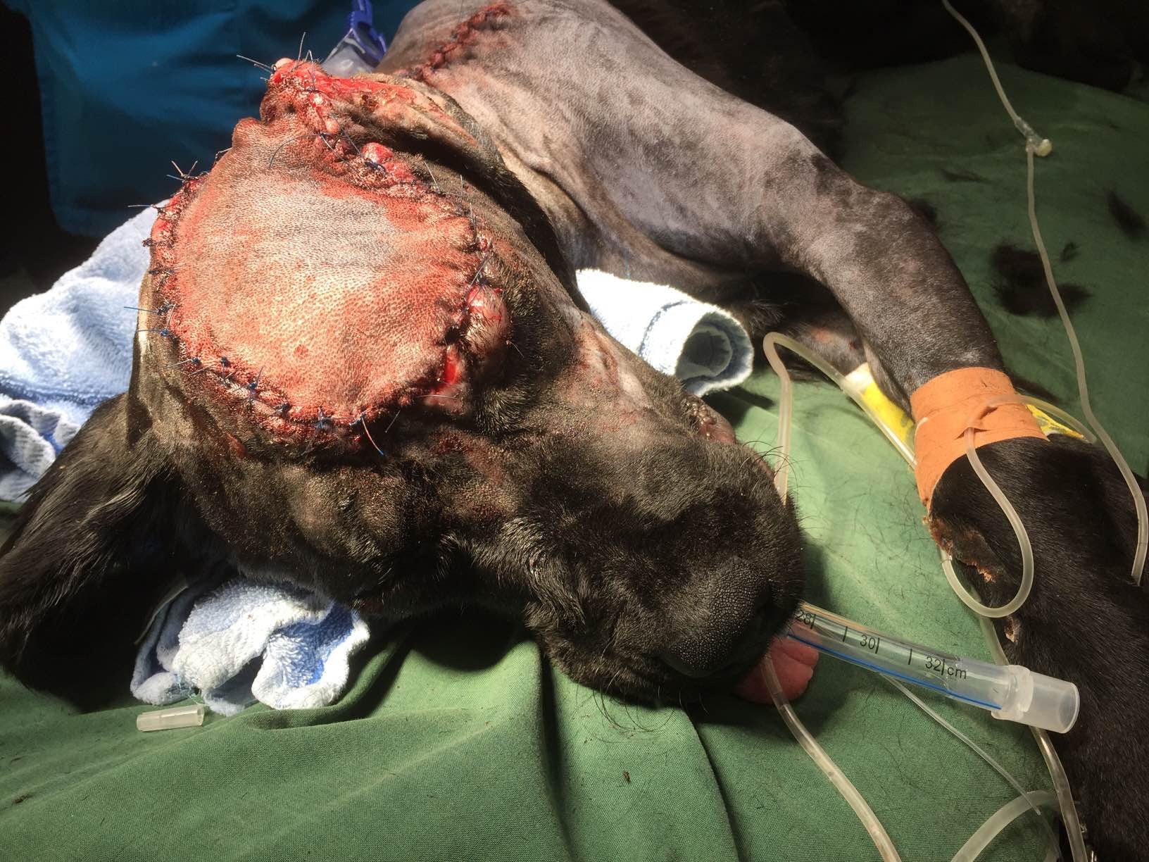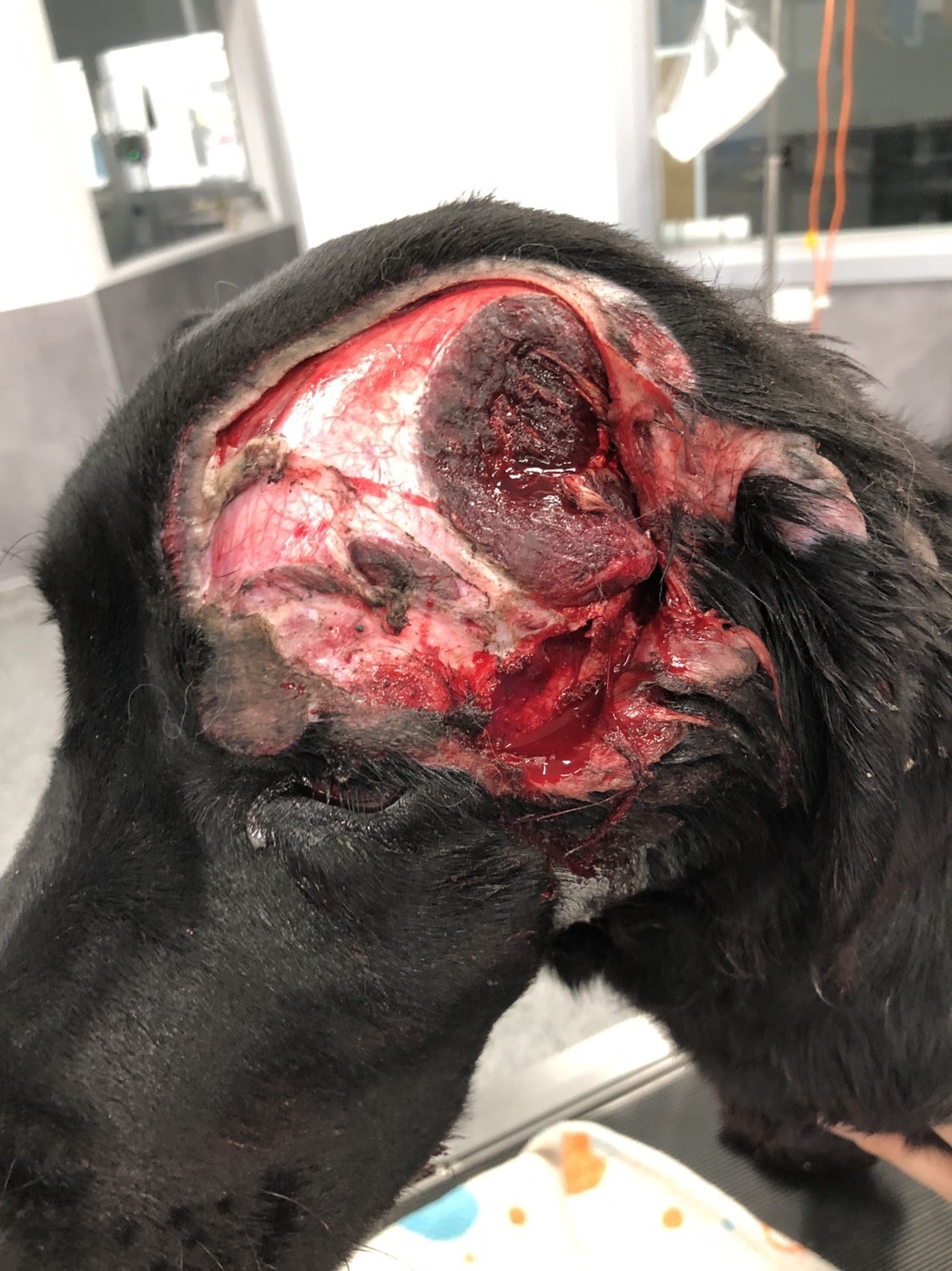 The skin off of Maggie’s neck was used as a transplant over the missing tissue on her skull. She continued to spend the day being minded at the hospital until her stitches came out.